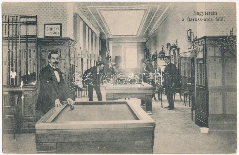 1913 Budapest VIII. Magyar Szalon Kávéháza, Nagyterem a Baross utca felől, belső biliárd asztalokkal, Tulajdonosok Jakobovics és fia. Üllői út 14 és Baross utca 11.