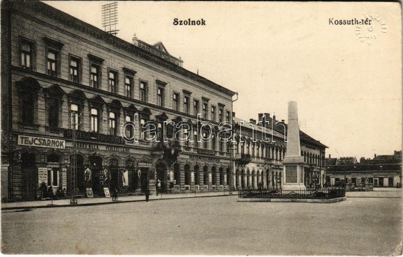 1914 Szolnok, Kossuth tér, tejcsarnok, Dr. Szegő fogorvos, Perlesz Lajos, Boros Béla és Lehoczky Mihály üzlete, Honvéd szobor, Külső Szolnok Megyei takarékpénztár. Gerő Ignác kiadása 2651. (EK)