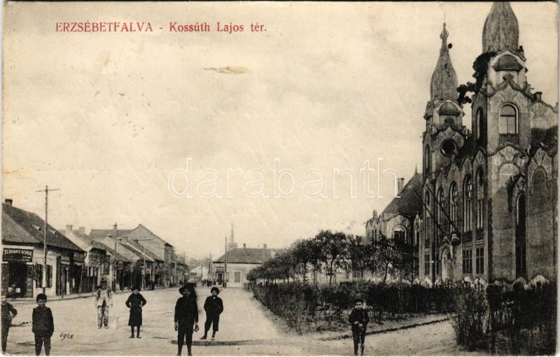 Beschreibung: 1916 Budapest XX. Pestszenterzsébet, Pesterzsébet, Erzsébetfalva; Kossuth Lajos tér, Schwartz Henrik üzlete, Városháza