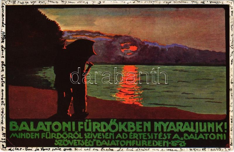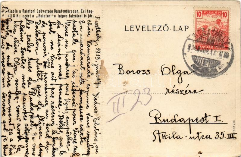 1919 Balaton, Balatoni fürdőkben nyaraljunk! Minden fürdőről szívesen ad értesítést a Balatoni szövetség. Ezért a "Balaton" c. képes folyóirat is jár. Turisztikai reklám (EK)