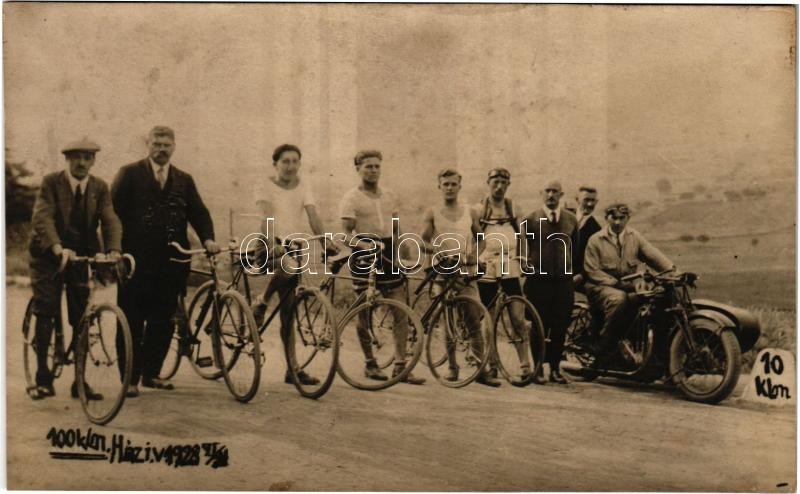 1928 Budapest, 100 km-es házi kerékpár verseny, biciklisták csoportképe, oldalkocsis motorkerékpár. photo (fl)