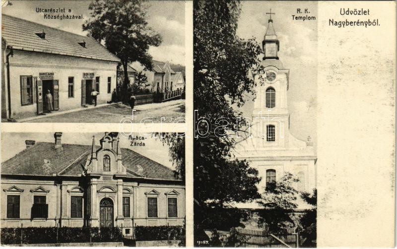 Beschreibung: 1930 Nagyberény (Siófok), Római katolikus templom, Apácazárda, utca, községház, Boncz János vegyeskereskedés üzlete, bor, sör és pálinka mérés
