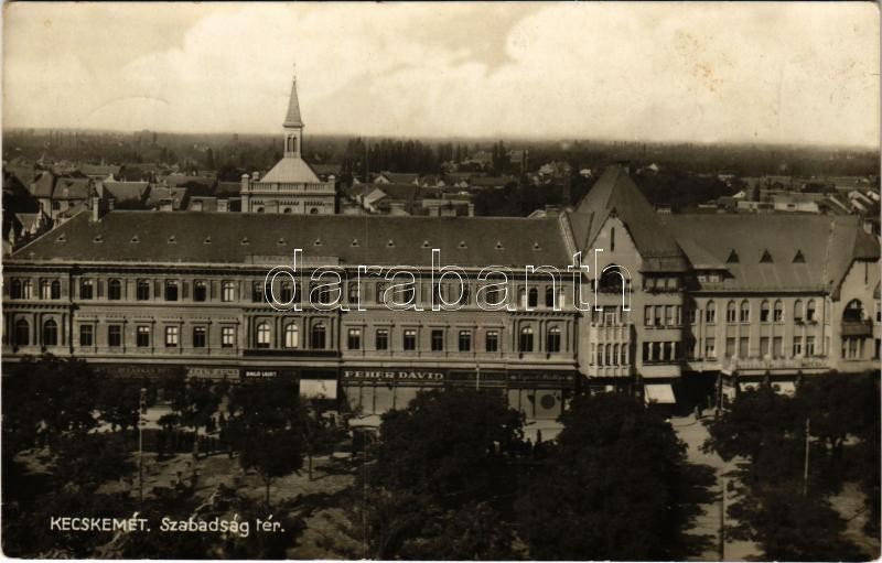 1932 Kecskemét, Szabadság tér, Dr. Farkas Béla, Fekete Soma, Bagó Lajos, Fehér Dávid, Grünblatt Lajos és Egri Fülöp üzlete, drogéria, Takarékpénztár Egyesület, piac (fl)