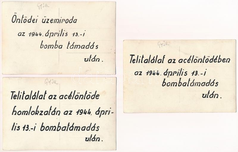 Beschreibung: 1944 Győr, telitalálat az acélöntödében az április 13-i bombatámadás után, öntödei üzemiroda és homlokzat romjai - 3 db eredeti fotó