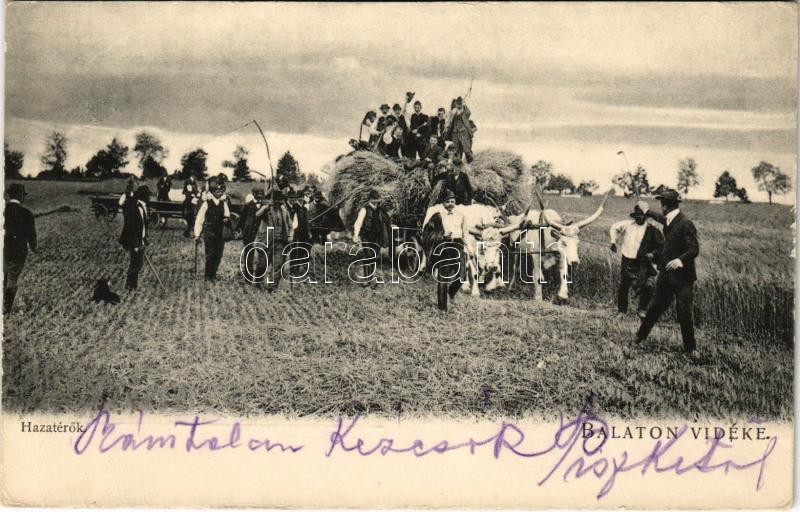 Balaton Vidéke, hazatérők a mezőről ökörszekérrel. D.K.F.E. 908. (EK) https://www.darabanth.com/de/38-Gross-Auktion/38.1/Ansichtskarten/Ungarn~15644/Balaton-Videke-hazaterok-a-mezorol-okorszekerrel-DKFE-908-EK~II2613774