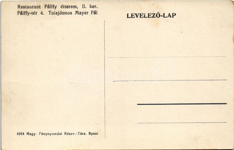Budapest II. Pálffy étterem, Mayer Pál tulajdonos, belső, Tokaji borok... https://www.darabanth.com/de/38-Gross-Auktion/38.1/Ansichtskarten/Ungarn~15644/Budapest-II-Palffy-etterem-Mayer-Pal-tulajdonos-belso-Tokaji-borok-Palffy-ter-4-ma-Bem-~II2591367