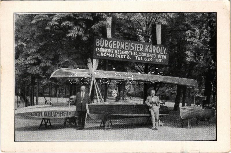 Beschreibung: Budapest III. Bürgermeister Károly féle csónakház, weekend telep és csónaképítő üzem. Kiadja Germ Károly, Római part 8. (EK)