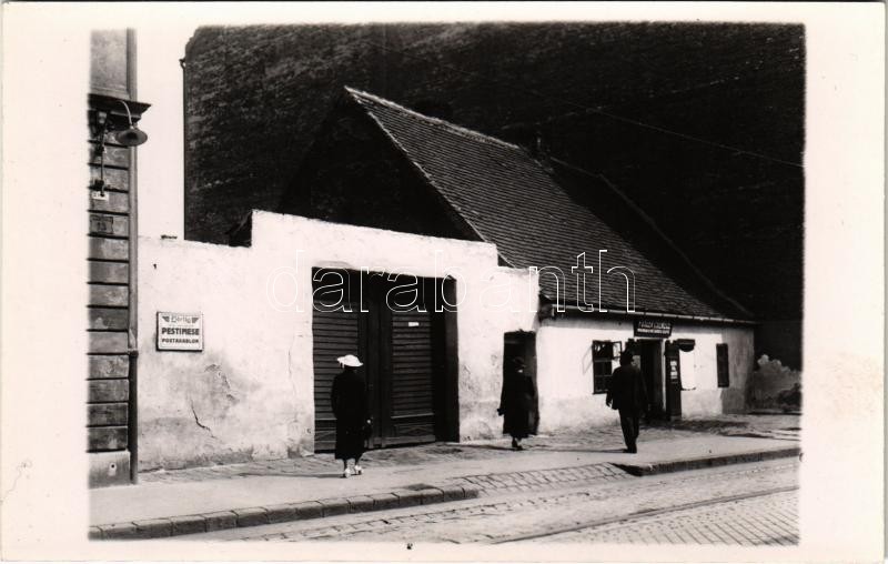 Beschreibung: Budapest III. Óbuda, Kórház utca 11-13., fűszer és csemege kereskedés üzlete, Flórián mozi műsor reklám a falon: Pestimese és Postarablók. photo
