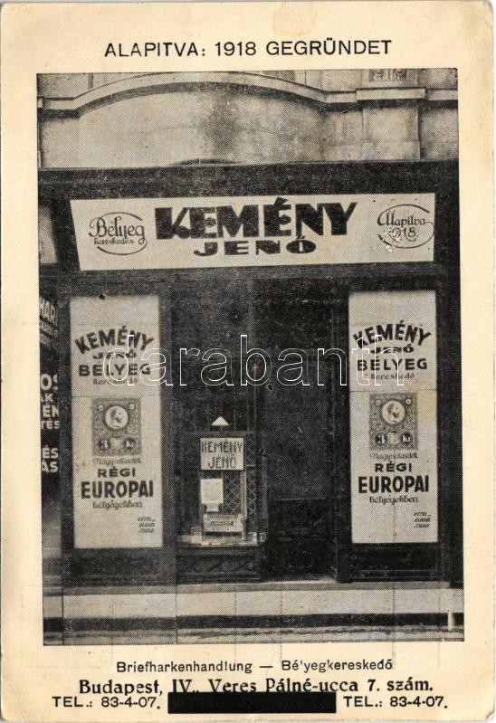 Budapest V. Kemény Jenő bélyegkereskedő üzlete, Alapítva 1918-ban. Ver... https://www.darabanth.com/de/38-Gross-Auktion/38.1/Ansichtskarten/Ungarn~15644/Budapest-V-Kemeny-Jeno-belyegkereskedo-uzlete-Alapitva-1918-ban-Veres-Palne-utca-7-EK~II2609653