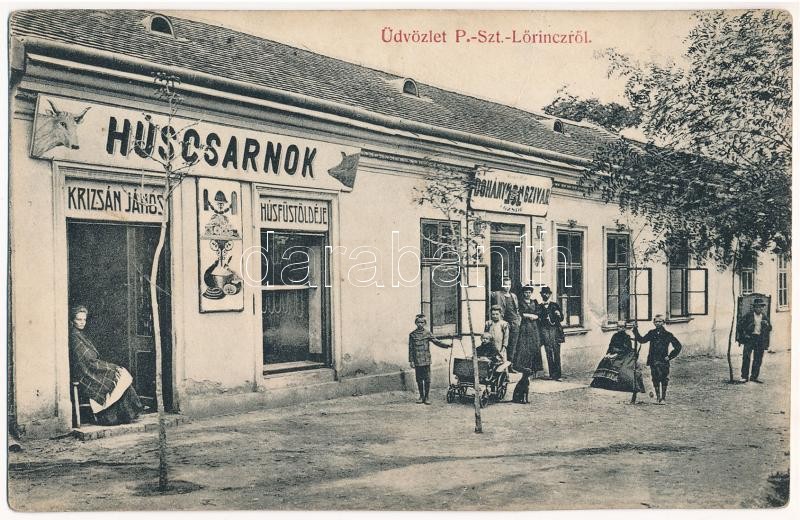Budapest XVIII. Pestszentlőrinc, Pusztaszentlőrinc, Szentlőrinc; Krizsán János húscsarnoka és húsfüstöldéje, dohány és szivar tőzsde üzlet. Holdházy István tőzsde kiadása (fl)