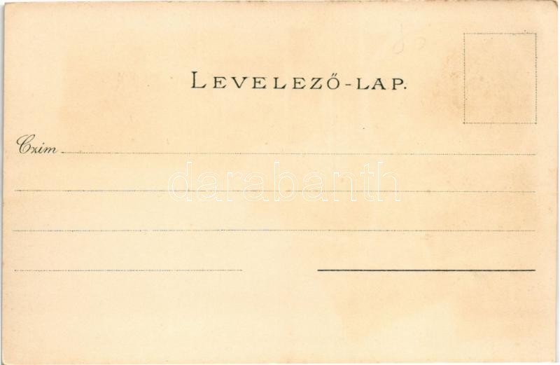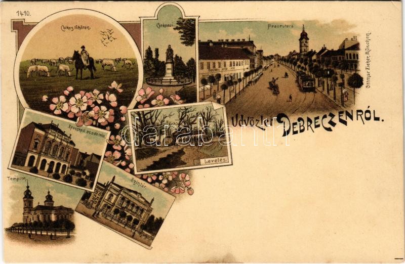 Debrecen, Csikós lóháton, Csokonai szobor, Piac utca, villamos, Kereskedelmi Akadémia, Színház, templom, Leveles csárda, étterem. Ottmar Zieher 1410. Art Nouveau, floral, litho