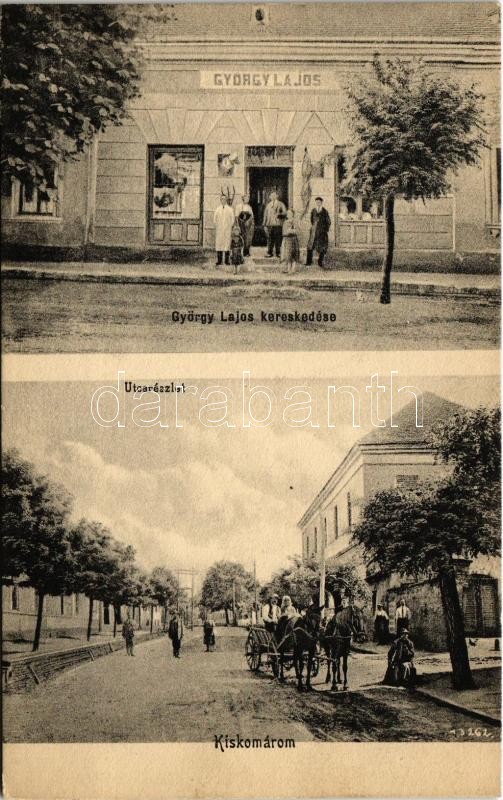 Beschreibung: Kiskomárom (Zalakomár), utca, György Lajos kereskedő üzlete és saját kiadása