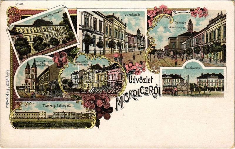 Miskolc, Református főgimnázium, Tüzérségi laktanya, Mindszenti templom, MÁV üzletvezetőség, Rudolf laktanya, Kereskedelmi és iparkamara, Városház tér, színház, tűzoltó őrtorony. Lövy József fia kiadása, Art Nouveau, floral, litho