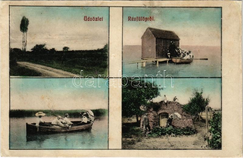 Beschreibung: Révfülöp, út, fürdőkabin, csónakázók, borospince. Schwarcz József kiadása (r)