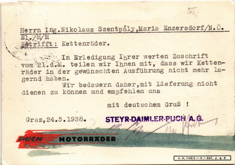 1938 Puch, Motorräder Österreichische Qualitätsarbeit. Steyr-Daimler-P... https://www.darabanth.com/de/38-Gross-Auktion/38.1/Ansichtskarten/Werbungen~15735/1938-Puch-Motorrader-Osterreichische-Qualitatsarbeit-Steyr-Daimler-Puch-AG-Graz-Fuhrhofgasse~II2612781