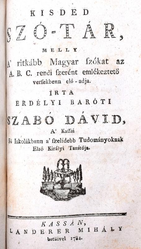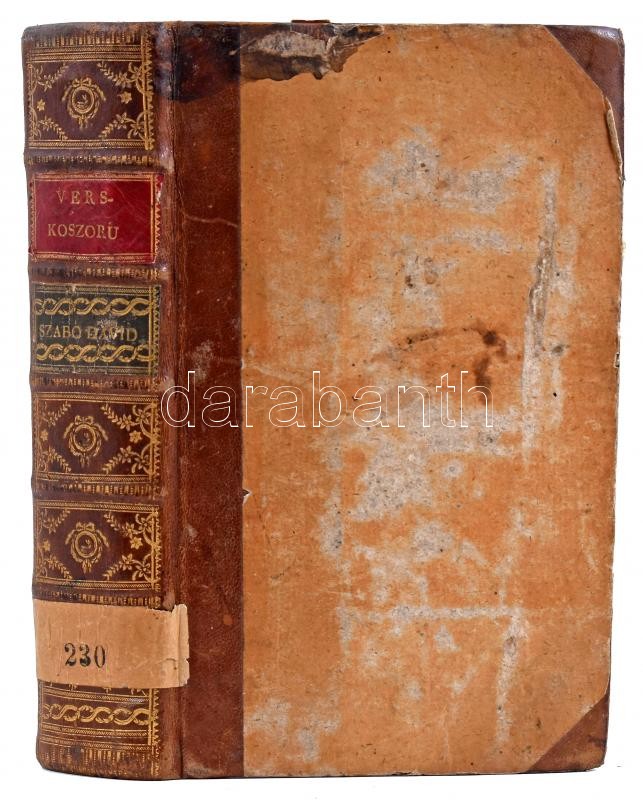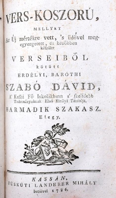 [Baróti] Szabó Dávid (1739-1819): Vers-koszorú, mellyet Az Új mértékre vett, 's üdővel megegyengetett, és későbben készültt verseiből kötött erdélyi baróthi - -,... I-III. szakasz. Első szakasz: Virgilius rendi szerént. Második szakasz: Alagyák, és némelly lantosok. Harmadik szakasz: Elegy. [Egybekötve.] Kassa, 1786., Füskúti Landerer Mihály, 176; 168; 151+5+4 p. Az 1777-es ,,Uj mértékre vett külömb verseknek három könyvei" c. könyv második kiadása. Hozzákötve: [Baróti] Szabó Dávid: Kisded szó-tár, melly A' ritkább Magyar szókat az A. B. C. rendi szerént emlékeztetö versekbenn elő-adja. Írta: Erdélyi Baróti - - . Kassa, 1784., Landerer Mihály, 104 p. Első kiadás. A Kisded szótár fontos nyelvtörténeti forrásmunka: a szerző ritka régi és tájnyelvi szavakat gyűjtött össze hexameteres formában. A végén levő "Toldalék" Verseghy Ferenc műve. Későbbi aranyozott gerincű, bordázott félbőr-kötés, piros és zöld címkékkel a gerincen, régi intézményi bélyegzővel és a gerincen régi könyvtári címkével, a címlapon és az elülső szennylapon bejegyzésekkel, kopott, foltos borítóval.