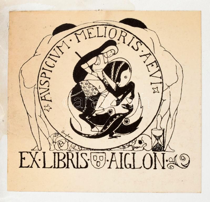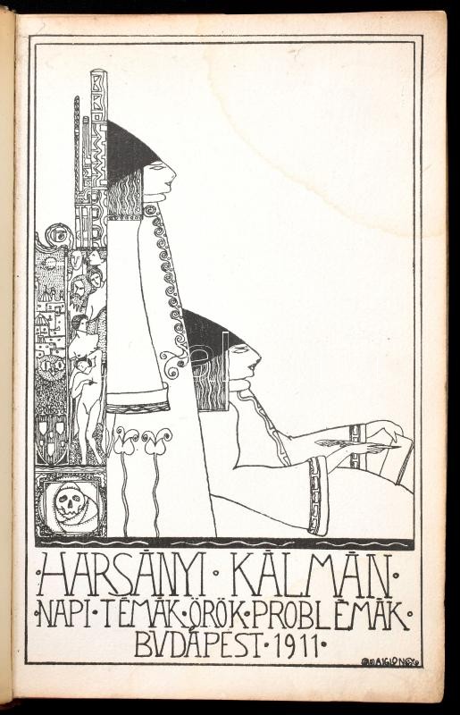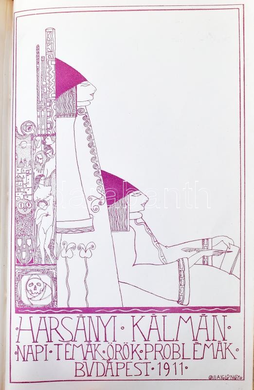 Harsányi Kálmán: Napi témák, örök problémák. Az illusztrátor, Sassy Attila 'Aiglon' részére DEDIKÁLT példány. Bp., 1911,(Szatmárnémeti, Pázmány-Sajtó-ny.), 1 (díszcímlap)+ 120 p.+7 t. Sassy Attila 'Aiglon' egy illusztrációjának 9 reprodukciójával (díszcímlap, egy oldalszámozáson belüli, 7 különféle színváltozatú.) Kiadói pergamen-kötésben, az elülső borítón Sassy Attila 'Aiglon' illusztrációjával, Hochwir Ferenc-kötés, aranyozott felsőlapélekkel, benne néhány foltos lappal (kb. 5 lap), kissé foltos borítóval. Kézzel számozott (6./100) példány. A szerző, Harsányi Kálmán (1876-1929) író, drámaíró, kritikus által Sassy Attila 'Aiglon' (1880-1967) grafikus, festőművész, a könyv illusztrátora részére szóló DEDIKÁLT, dátumozott (B(uda)pest 1911 dec. 24.) példány. "Könyvárusi forgalomba nem kerül. Csupán a 61-100 számú példányok szerezhetők meg." Valamint az elülső tábla belsején Sassy Attila 'Aiglon' saját ex libris-szével, klisé, papír, jelzett a dúcon, 8x8 cm