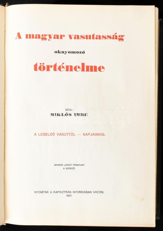 Miklós Imre: A magyar vasutasság oknyomozó történelme. A legelső vasúttól - napjainkig. A "Történetírás" Könyvei I. kötet. Szerk.: Dr. Belitzky János. Vác, 1937, Kapisztrán Nyomda-ny. Kiadói díszesen aranyozott, dombornyomásos egészvászon-kötésben, kopott borítóval, a hátsó borítón karcolásnyommal, kissé foltos lapélekkel. Számozott, 066. számú számozott, és a szerző által DEDIKÁLT példány.