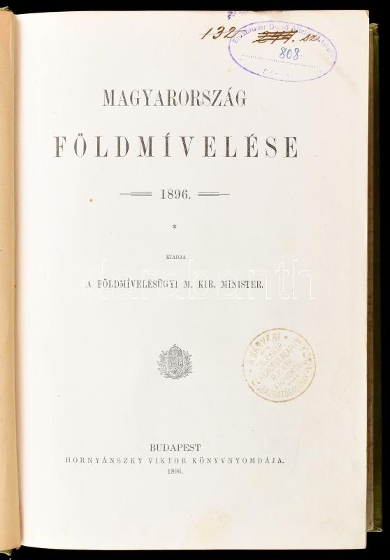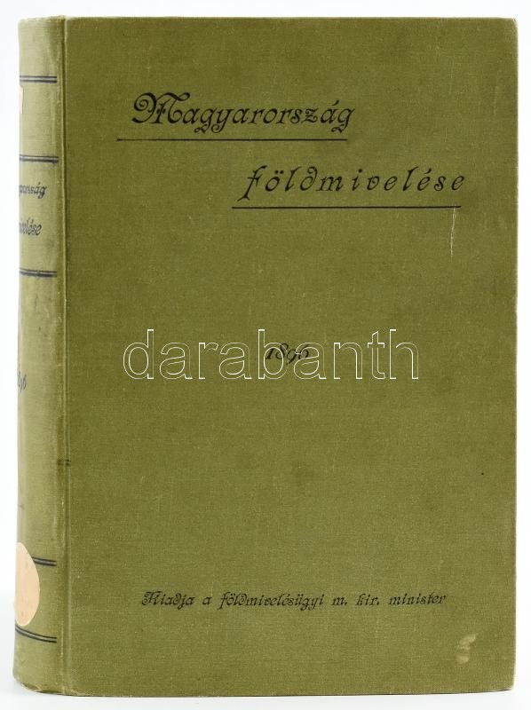 Magyarország Földmívelése 1896. Kiadja: A Földmívelésügyi M. Kir. Minister. Bp., 1896., Hornyánszky Viktor, XX+892+1 p. Többek között Inkey Béla, Szinyei-Merse József, Tormay Béla, Landgraf János, Cserháti Sándor, Szilassy József, Lónyay Ferencz, Döhrmann Henrik és Egerváry Gyula írásaival egyebek mellett a sertés-, selyem- és méhtenyésztés, a halászat, vadászat, lótenyésztés, szőlőművelés és borászat témaköreiben. Kiadói egészvászon-kötés, Gottermayer-kötés, márványozott lapélekkel, a gerincen folttal, a borítón kis kopásnyomokkal, a gerincen régi címkenyomokkal, régi intézményi bélyegzőkkel.