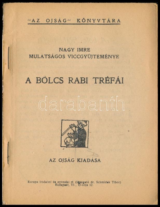 A Bölcs Rabi tréfái. Az Ojság Könyvtára. Nagy Imre Mulatságos Vicctgyűjteménye. Bp.,(1923.), Az Ojság, (Europa-ny.), 96 p. Kiadói papírkötés, szakadt, foltos borítóval, a hátsó borítón firkával.