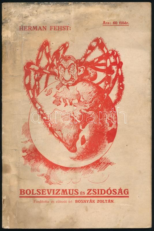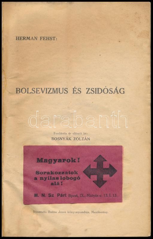 Herman Fehst: Bolsevizmus és a zsidóság. FordÃtotta és elÅ‘szót Ãrta: Bosnyák Zoltán. MezÅ‘berény,[1936.], Baltha János-ny., 80 p. Kiadói papÃrkötés, foltos, megviselt állapotban. A cÃmlapon beragasztott nyilas prospektussal/cÃmkével: "Magyarok! Sorakozzatok a nyilas lobogó alá! M. N. Sz. Párt", 6x10 cm. A könyv szerepel az 1945-ben az Ideiglenes Nemzeti Kormány által BETILTOTT fasiszta, és szovjetellenes könyvek listáján.