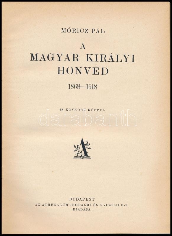 Móricz Pál: A magyar királyi honvéd 1868-1918. 88 egykorú képpel. Bp.,(1928),Athenaeum, 211+1 p. Gazdag szövegközti fekete-fehér fotókkal illusztrálva. Kiadói egészvászon kötésben, kissé foltos, kissé kopott borítóval, egyébként jó állapotban.