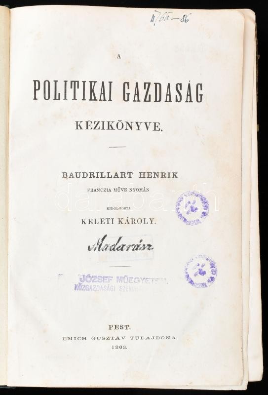 Baudrillart Henrik-Keleti Károly: A politikai gazdaság kézikönyve. - - franczia műve nyomán kidolgozta Keleti Károly. Pest, 1863, Emich Gusztáv, VI+4+419 p. Átkötött félvászon-kötésben, kopott borítóval, intézményi bélyegzőkkel. Keleti Károly (1833-1892) neves közgazdász, statisztikus, a magyar hivatalos statisztika megteremtőjének első, nyomtatásban megjelent műve, melyet a neves francia közgazdász, Henri Baudrillart (1821-1892) műve alapján írt. Ritka.