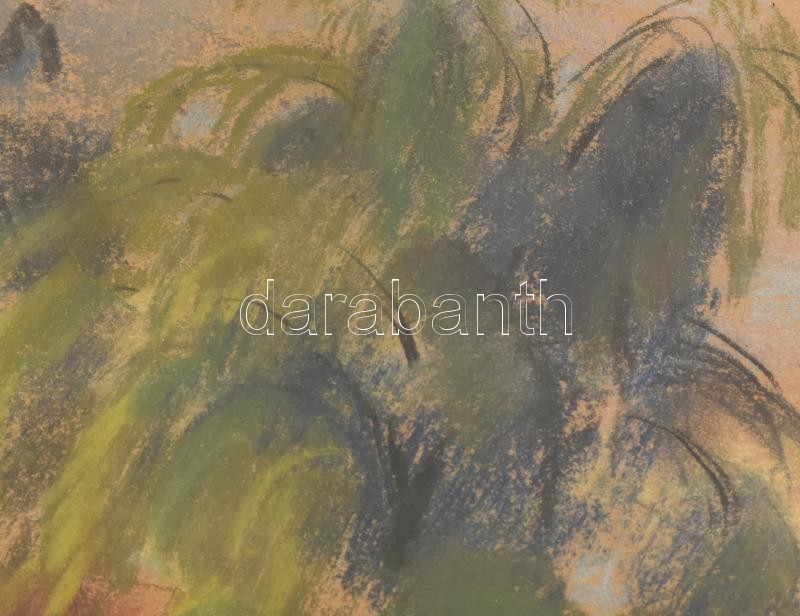 Vén Emil (1902-1984): Kertek alján, 1934. Pasztell, papír. Jelezve jobbra lent. Lap alján Vén Emil autográf ajándékozási soraival 1935-ből. Üvegezett fakeretben. Keret hátoldalán Freimann Miksa képkeretező, Szeged, korabeli címkéjével. 24×36 cm