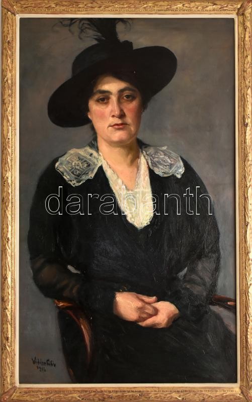 Beschreibung: Widder Félix (1874-1939): Hölgy divatos kalapban, 1916. Olaj, fa, jelzett. Dekoratív fakeretben. 98x59 cm