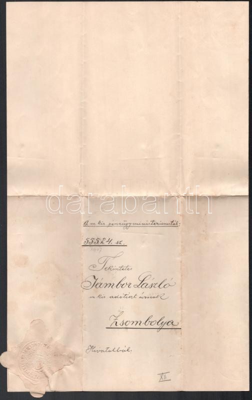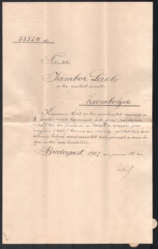 1907 Wekerle Sándor (1878-1963) pénzügyminiszter (és miniszterelnök, második Wekerle-kormány,1906. április 8. 1910. január 17.) autográf aláÃrása egy kinevezési papÃron, Jámbor László zsombolyai (Temes vm., Jimbolia/Hatzfeld) m. kir. adóhivatali segéd részére, fejléces papÃron, papÃrfelzettel, hajtva.