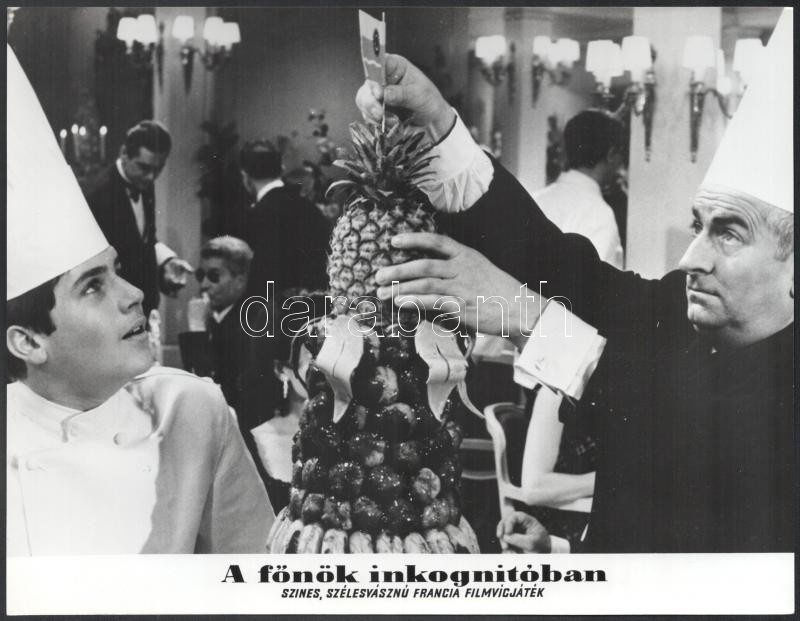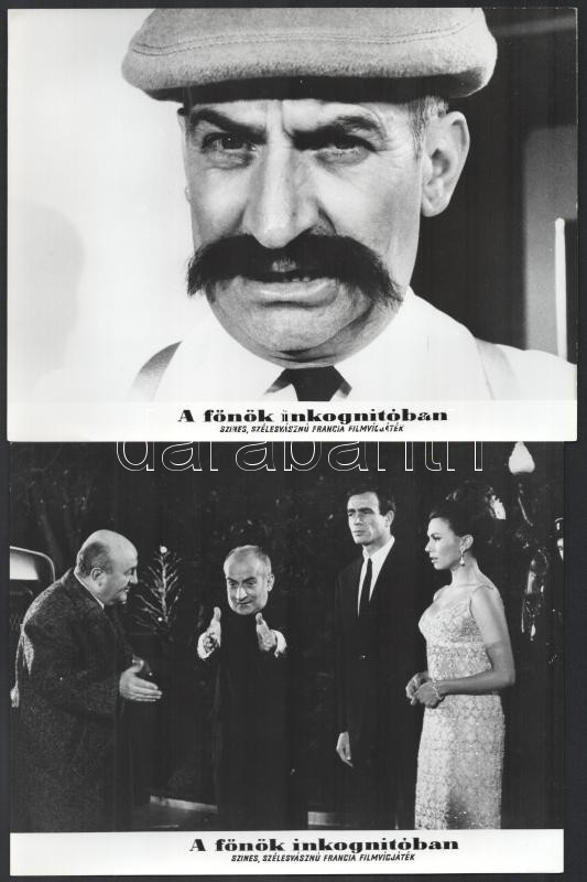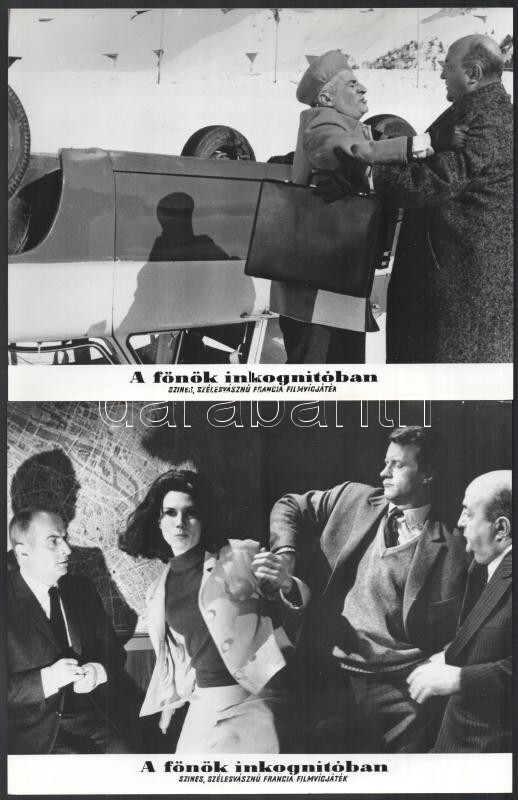 1966 ,,A főnök inkongnitóban" című francia film jelenetei és szereplői (köztük Louis Funes), 13 db vintage produkciós filmfotó, a film illusztrált magyar plakátját külön tételben ld. a plakátok között, 18x24 cm