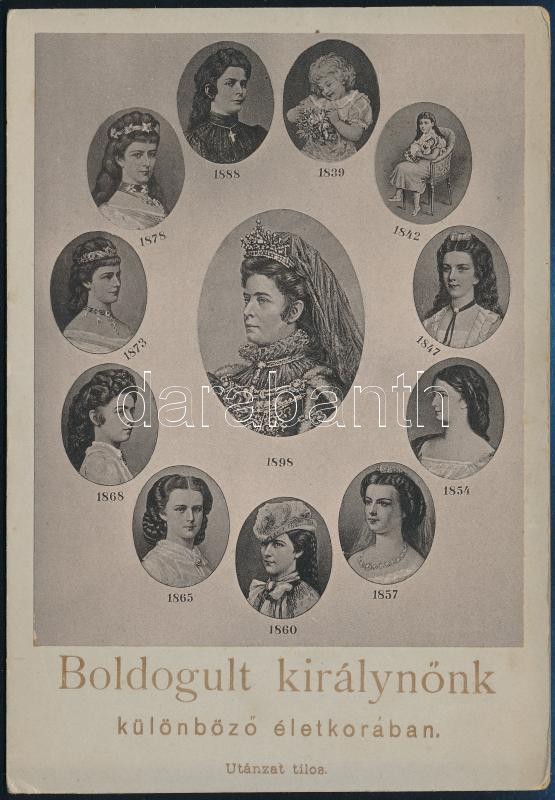 cca 1898 Boldogult királynőnk, Erzsébet királyné, Sisi (1837-1898), különböző életkorában, keményhátú fotó, 16,5x11,5 cm / Portraits of Empress Elisabeth of Austria, photograph composition on cardboard, 16,5×11,5 cm
