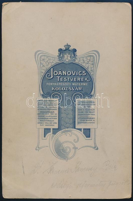 cca 1910 Dr. kenesei Kenessey Béla (1858-1918) az Erdélyi református egyházkerület püspöke 1907-től haláláig. Vintage keményhátú fotó a Joánovics Testvérek kolozsvári műterméből, hátoldalán feliratozott, sarkaiban törésnyomokkal, felületi kopásokkal, 24x16 cm