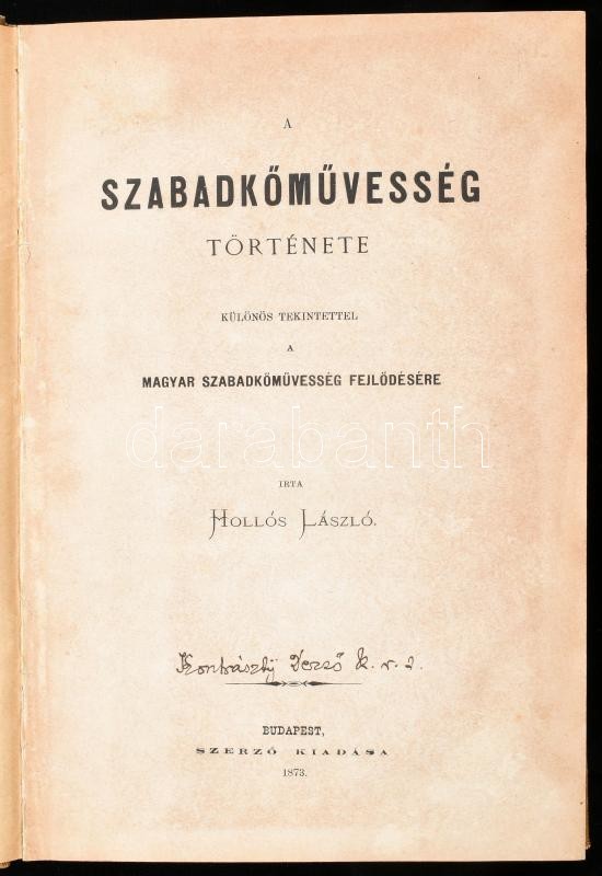 Hollós László: A szabadkőművesség története. Különös tekintettel a magyar szabadkőművesség fejlődésére. Bp., 1873, a szerző kiadása (Wilckens Gy. ny.), 105+(2) p. Könyvkötői félvászon-kötés (Nemzeti Sajtóvállalat Könyv- és Papírkereskedése, Szeged kötése), a címlapon tulajdonosi névbejegyzéssel, a tartalomjegyzéknél ceruzás jegyzetekkel.
