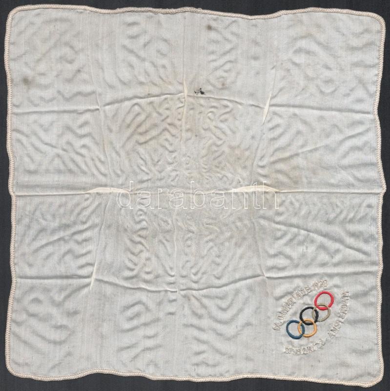 Beschreibung: 1928 "IX. Olympiad 1928 St. Moritz Amsterdam" feliratú és olimpiai öt karikás hímzésű selyem zsebkendő, hajtásnyomokkal, foltos, kis lyukkal, 21x21 cm