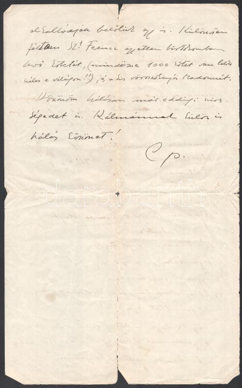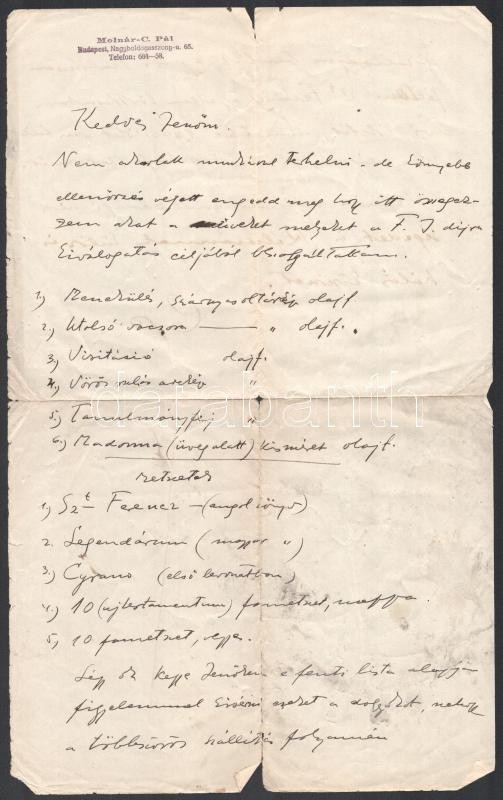 cca 1935 Molnár C. Pál (1894-1981) festőművész, grafikus által kézzel írt levél ismeretlennek, Jenő megszólítással, amelyben egy díjra beadott festményekről, általa illusztrált könyvekről és metszetekről állít össze listát. Másfél beírt oldal, Molnár C. Pál autográf aláírásával és bélyegzőjével, hajtásnyomokkal, kisebb szakadásokkal.