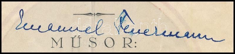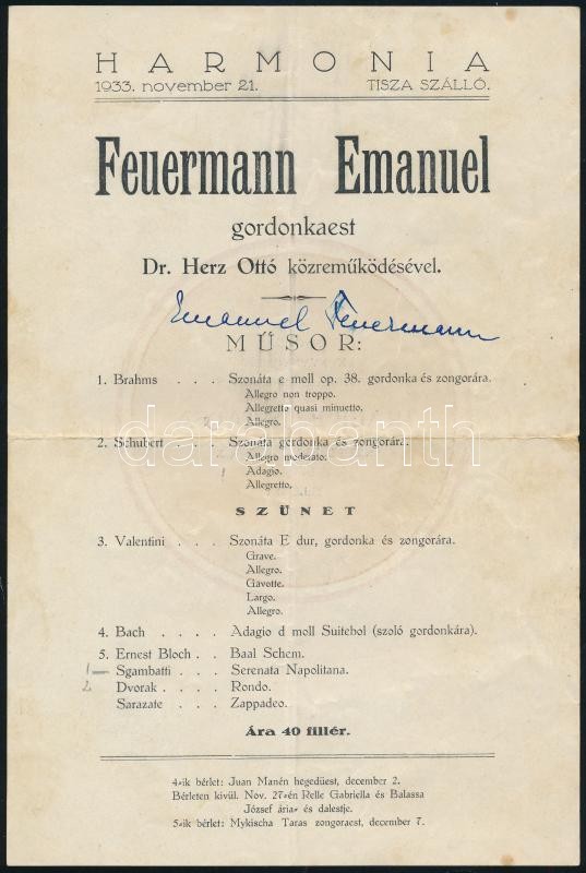 Beschreibung: Feuermann Emanuel gordonka művész estjének műsora, a művész autográf aláírásával