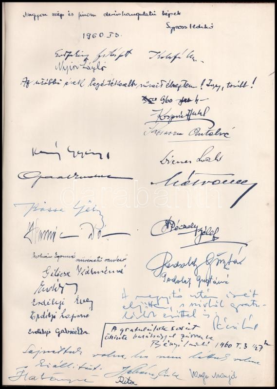 Sárdy Brutus (1892-1970) festőművész 1959-ben rendezett kiállítása alkalmából készített vendégkönyv, sok-sok neves festőművész, művészettörténész és más személyiség autográf aláírásával: Kmetty János, Farkasházy Miklós, Miháltz Pál, Istókovits Kálmán, Bor Pál, Benkhard Ágost, Csejtei Joachim Ferenc és felesége, Baksa Soós György, Leszkovszky György, Remsey Iván, Pogány Ö. Gábor, Frank János, B. Supka Magdolna, Pataki Dénes, Abonyi Arany, Csap Erzsébet, Darázs Endre, Devich Sándor, Rév Miklós stb., valamint hosszab-rövidebb bejegyzésekkel Haranglábi Nemes József, Bényi László, Szalontay József, D. Borbély Gizella, Heitler László stb. tollából. Az aláírások jelentős része beazonosításra vár! Összesen több mint 400 autográf aláírással. Vászonkötésben, egyik lap kijár.