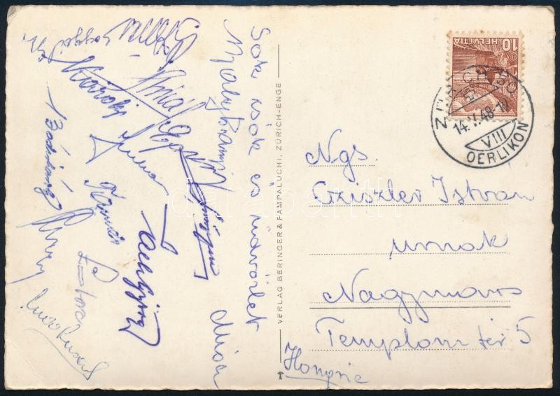 1948 Grasshoppers - Ujpest (6:0) barátságos labdarúgó mérkőzésről a magyar csapat tagjai által aláírt képeslap. Károlyi, Balogh II. Laborcz, Nagymarosi, Egresi, Szusza, Várnai / Autograph signed postcard of Ujpest football players from a match against Grasshoppers in Zürich