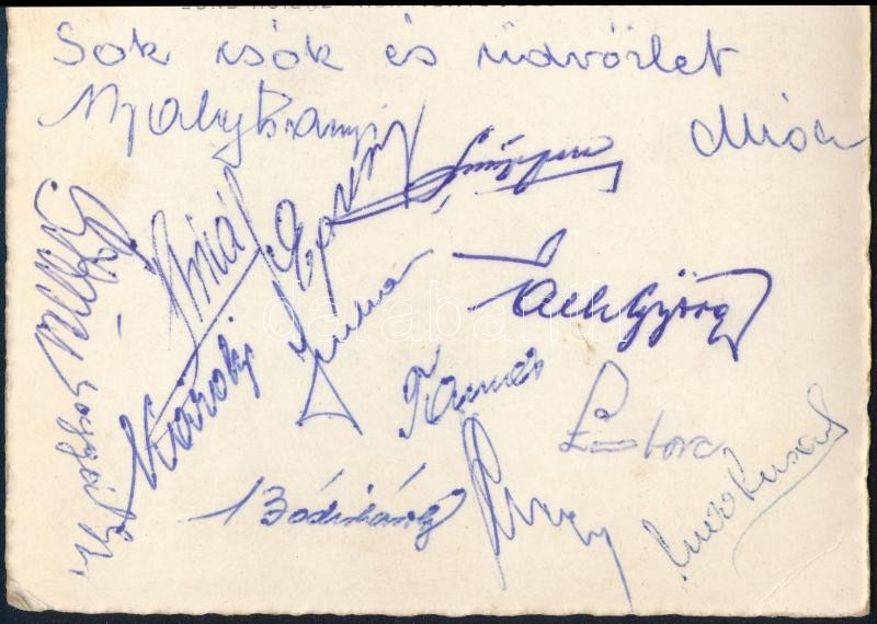 1948 Ujpest - Egyiptom olimpiai válogatott (0:0) labdarúgó mérkőzésről a magyar csapat tagjai által aláírt képeslap. Károlyi, Balogh II. Laborcz, Králdi, Nagymarosi, Egresi, Szusza, Várnai / Autograph signed postcard of Ujpest football players from a match against the Egypt Olympic team