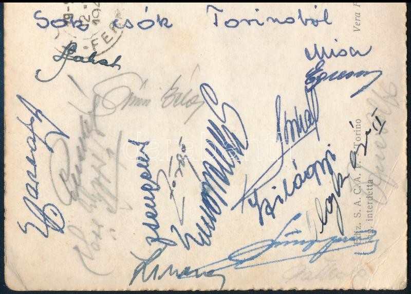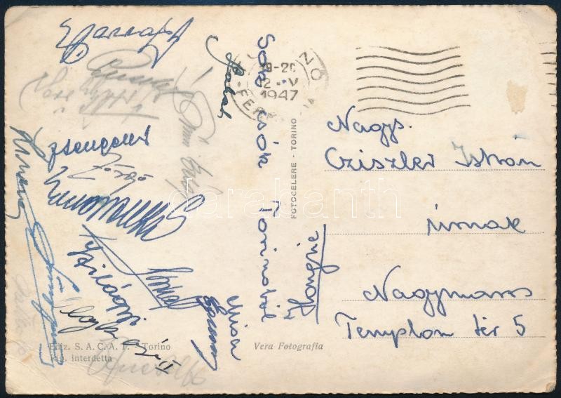 1947 Olaszország - Magyarország (3:2) labdarúgó mérkőzésről a magyar csapat tagjai által aláírt képeslap. Tóth, Rudas, Balogh II, Králdi, Szűcs, Nagymarosi, Egresi, Szusza, Zsengellér, Puskás. / Autograph signed postcard of the Hungarian national team football players from a match against Italy