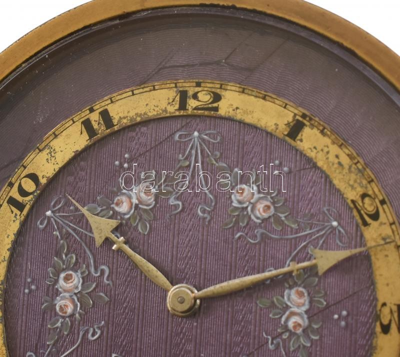 Gübelin mechanikus asztali óra, 8 napos feles ütÅ‘s szerkezettel, tisztÃtásra szorul, jelen állapotban megindul, de nem jár. Gyönyörű zománcozott számlappal, néhány helyen zománc repedésekkel, sérülésekkel. Svájc, 1920 körül, m: 12cm / Gübelin 8 days watch, needs repair, starts but does not work