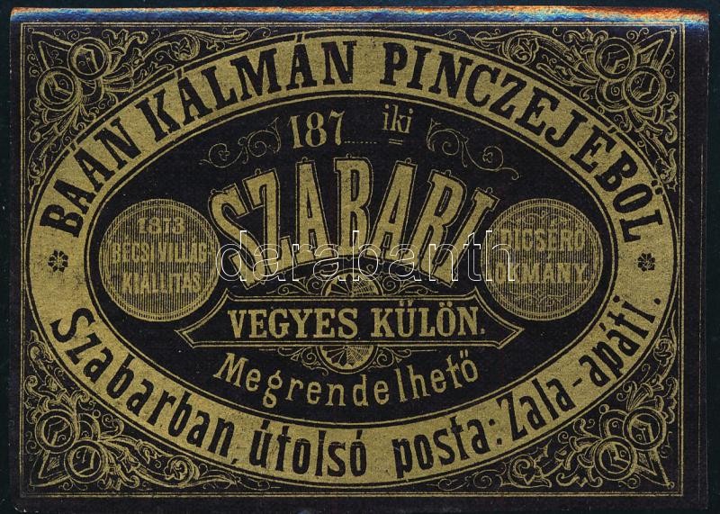 Szabari vegyes Baán Kálmán pincéjéből italcímke https://www.darabanth.com/de/38-Gross-Auktion/38.1/Kunst-Skulpturen-Historische-Dokumenten/Werbungen~15585/Szabari-vegyes-Baan-Kalman-pincejebol-italcimke~II2613786