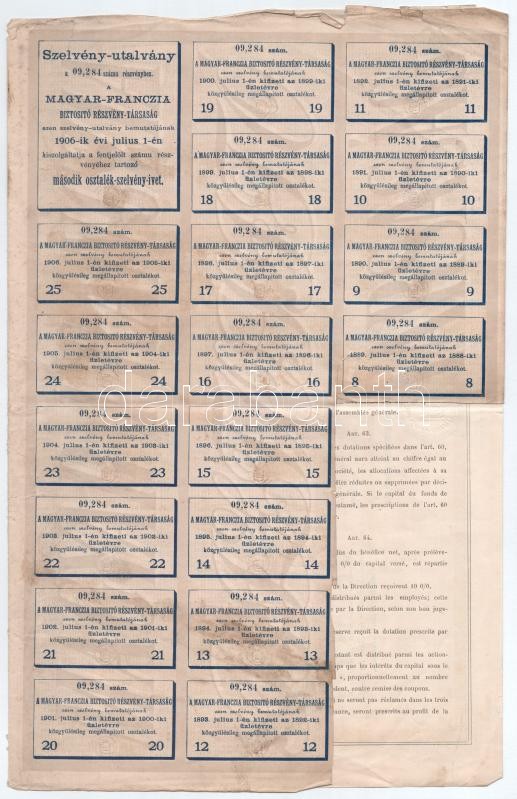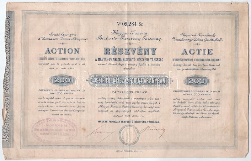Budapest 1884. "Magyar-Franczia Biztosító Részvény-Társaság" részvénye 200Ft-ról szárazpecséttel, bélyegzéssel, szelvényekkel T:III / Hungary / Budapest 1884. "Hungarian-French Insurance Company" share about 200 Forint with embossed stamp, overprint and coupons C:F