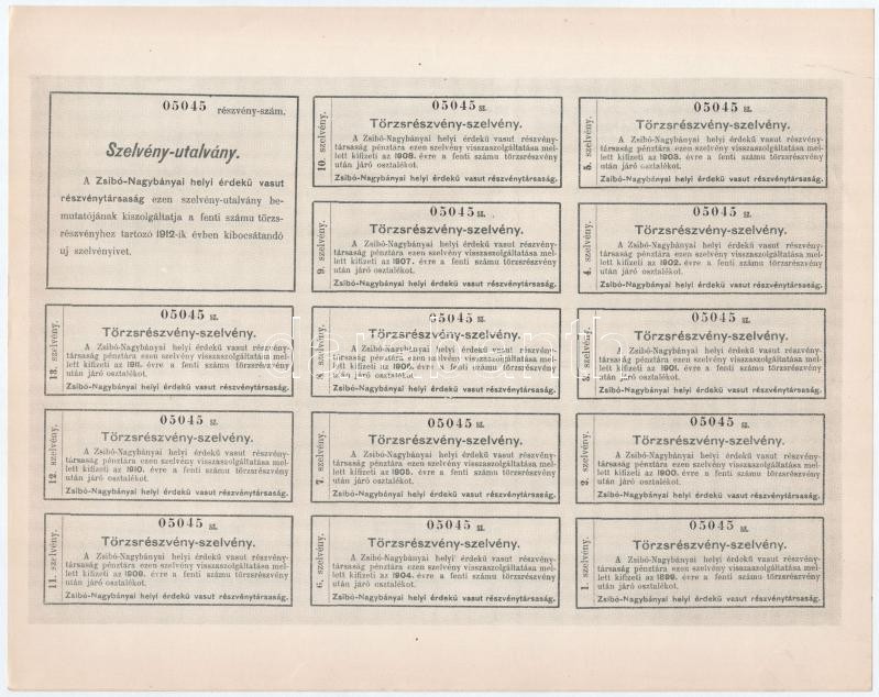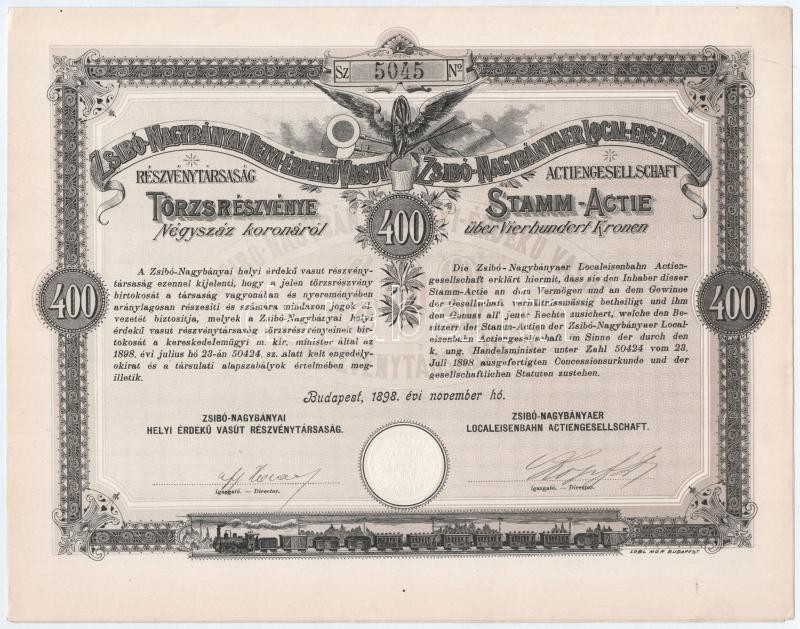 Budapest 1898. "Zsibó-Nagybányai Helyi-Érdekű Vasut Részvénytársaság" törzsrészvénye 400K-ról szárazpecséttel, szelvényekkel T:I- / Hungary / Budapest 1898. "Local Interest Railway Share Company of Zsibó-Nagybánya" share about 400 Corona with embossed stamp and coupons C:AU