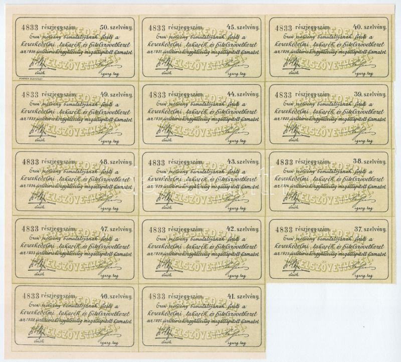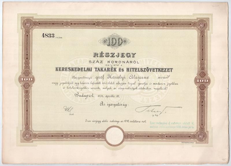 Budapest 1904. "Kereskedelmi Takarék és Hitelszövetkezet" névre szóló részvény 100K-ról, szelvényekkel, szárazpecséttel, felülbélyegzéssel (2x) T:I- / Hungary / Budapest 1904. "Kereskedelmi Takarék és Hitelszövetkezet" share about 100 Korona with shareholder's name, coupons, embossed stamp and overprint (2x) C:AU