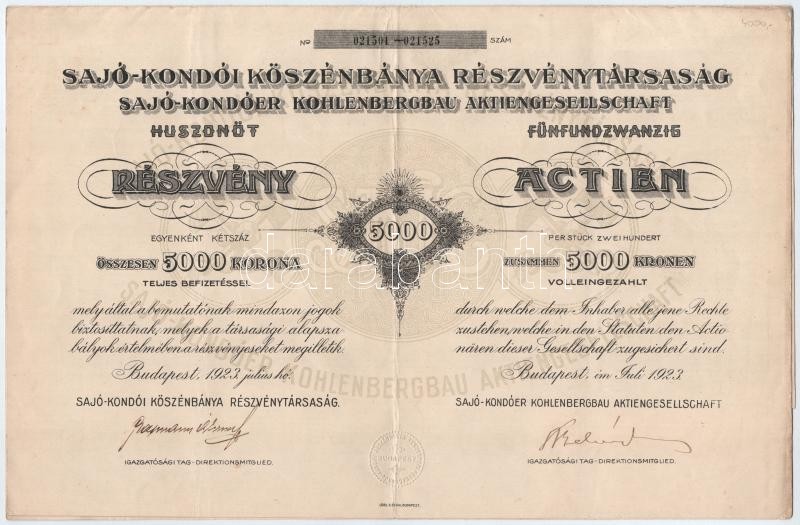 Budapest 1923. "Sajó-Kondói Kőszénbánya Részvénytársaság" 25db részvénye egyben, összesen 5000K-ról, szelvényekkel, szárazpecséttel T:III / Hungary / Budapest 1923. "Sajó-Kondó Coal Mine Share Company" 25pcs of shares in one, all about 5000 Kronen, with coupons and embossed stamp C:F