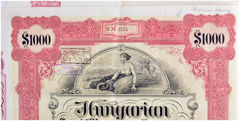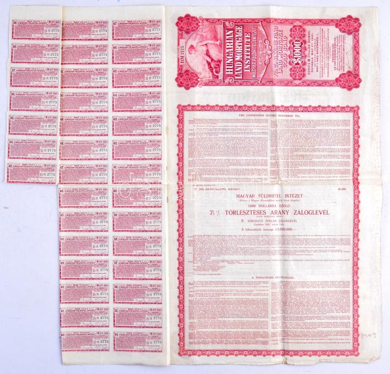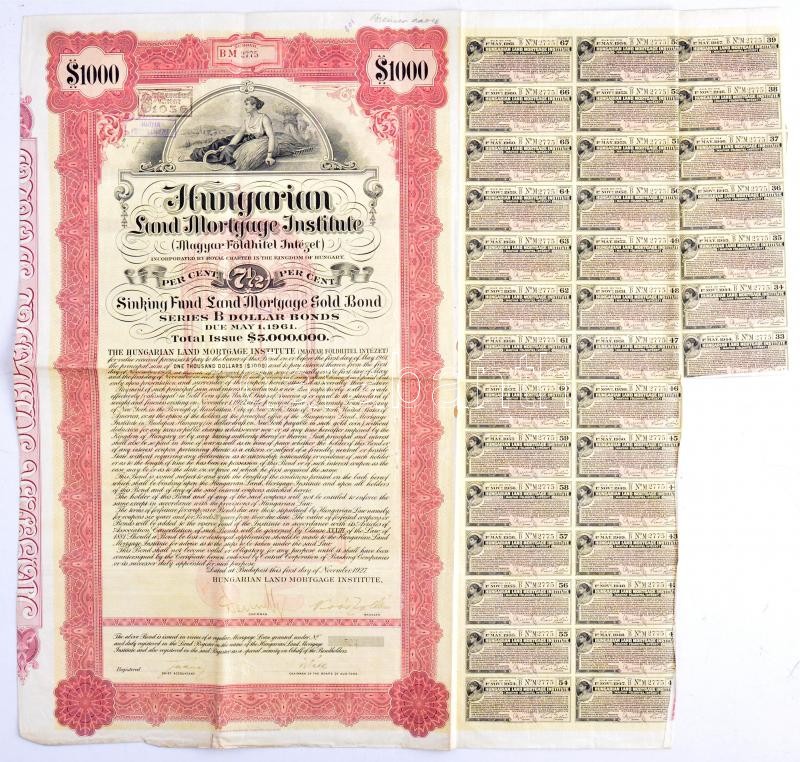 Budapest 1927. "Magyar Földhitel Intézet" 7 1/2% törlesztéses arany záloglevele 1000$-ról szárazpecséttel, szelvényekkel, bélyegzésekkel, angol és magyar nyelven T:III / Hungary / Budapest 1927. "Hungarian Land Mortgage Institute" 7 1/2% Sinking Fund Land Mortgage Gold Bond about 1000 Dollars, with embossed stamp, coupons and cancellations C:F