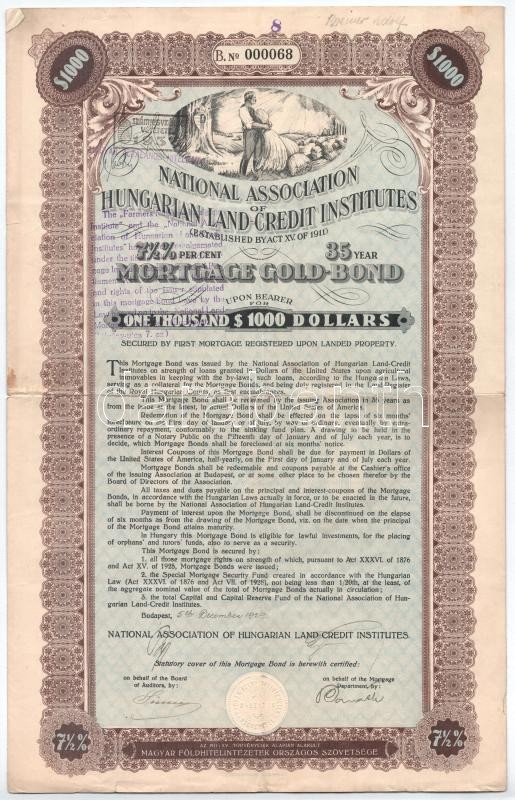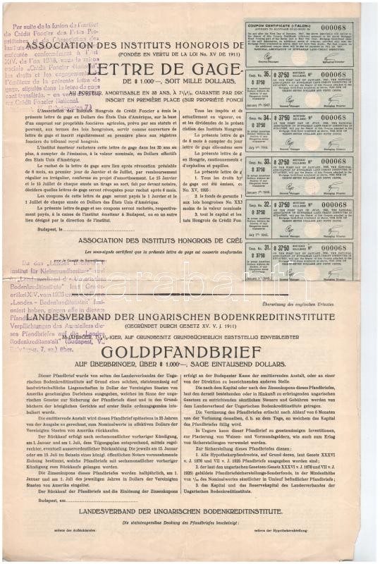Budapest 1929. "Magyar Földhitelintézetek Országos Szövetsége" 35 éves, 7 1/2%-os aranyzáloglevele 1000$-ról szárazpecséttel, szelvényekkel, bélyegzésekkel T:III lyuk / Hungary / Budapest 1929. "National Association of Hungarian Land-Credit Institutes" 7 1/2%, 35 year mortage gold-bond about 1000 Dollars, with embossed stamp, coupons and cancellations C:F hole