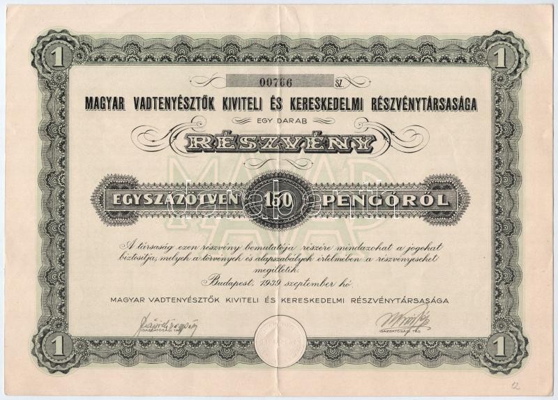 Budapest 1939. "Magyar Vadtenyésztők Kiviteli és Kereskedelmi Részvénytársasága" részvény 150P-ről, szelvényekkel és szárazpecséttel T:II- / Hungary / Budapest 1939. "Magyar Vadtenyésztők Kiviteli és Kereskedelmi Részvénytársasága (Export and Trade Share Company of Hungarian Wild Breeders)" share about 150 Pengő, with coupons and with embossed stamp C:VF